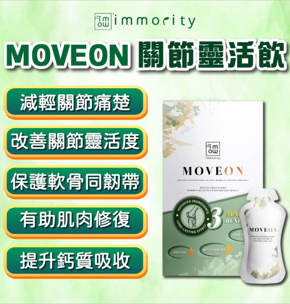 【MOVEON】含有三大歐美專利成分——Ovomet® 蛋殼膜、UC-II™ 第二型膠原蛋白及 BonePep™ 胜肽,能促進關節修復及再生;再配合薑黃萃取同維他命 D3,達到抗炎、強化骨密度及提升靈活度嘅功效。每日 1–2 包即可為關節補充營養,幫你重拾行得穩、動得順嘅健康生活。